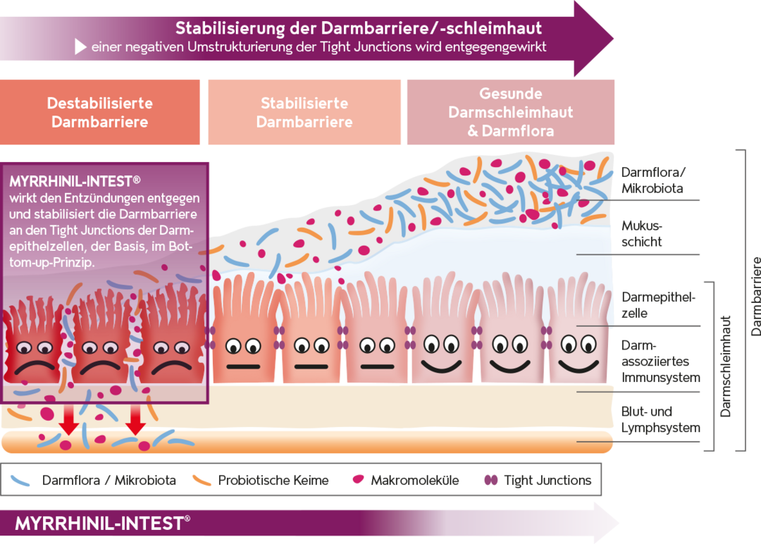 Der Einsatz von Probiotika kann dazu beitragen, die erste Schutzschicht der Darmbarriere - die Darmflora / Mikrobiotia / Darm-Mikrobiom - positiv zu beeinflussen. Probiotika enthalten lebensfähige Mikroorganismen, wie z.B. Milchsäurebakterien und Hefen. Die Auswahl des Probiotikums sollte individuell anhand der Untersuchungen des / der Therapeut*in erfolgen. Aktuelle Studien zeigen, dass sich die zugeführten Bakterien nur dann optimal ansiedeln können, wenn eine funktionierende Darmbarriere vorliegt, welche z. B. mit MYRRHINIL-INTEST® positiv beeinflusst werden kann. Den Bakterien wird so ein solides Fundament angeboten, auf dem sie sich ansiedeln und ihre Wirkung entfalten können.